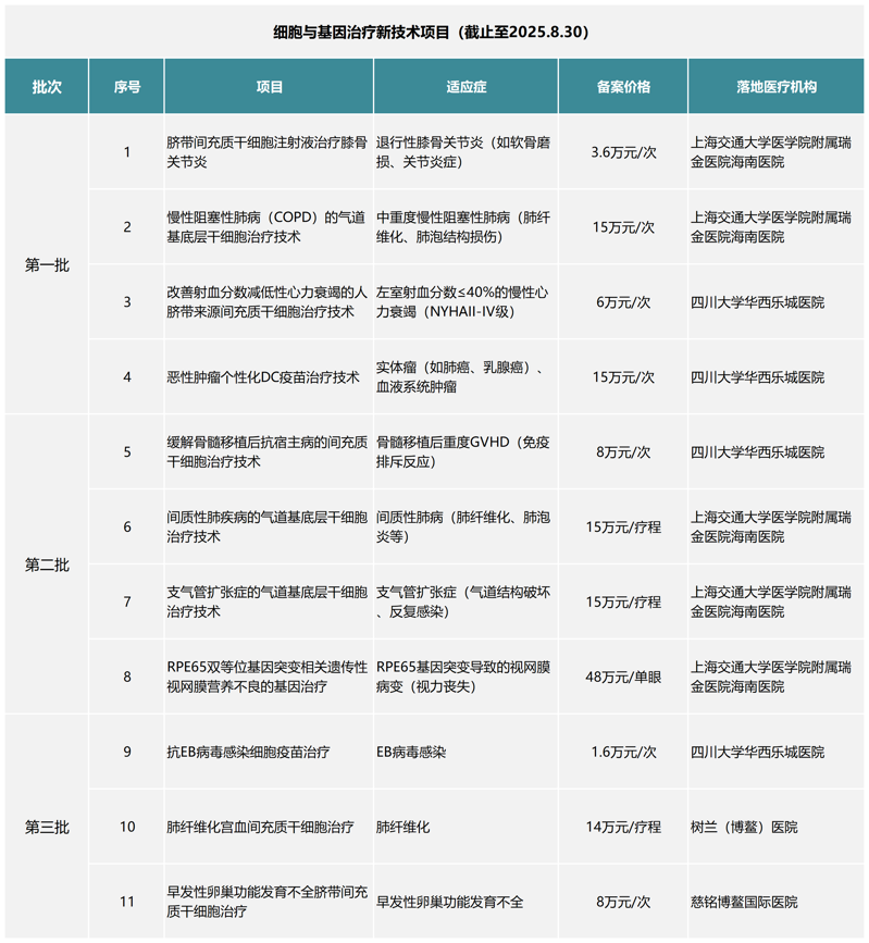 8月30日,海南博鳌乐城国际医疗旅游先行区举办生物医学新技术政策推介会。会上正式公布了新一批(第三批)获批的细胞与基因治疗(CGT)新技术项目,同时明确了这些项目的定价标准及对应的落地医疗机构。